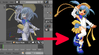 Thanks to this Blender shader, one can turn 3D models into classically-styled 2D sprites. It took a bit of fiddling, and my rusty Japanese skills didn't help a great deal, but after a bit of kicking, I had a production pipeline set up for churning out humanoid characters that would fit in with a game like this. I can now not only use my functional 3D skill to replace my absent 2D ones, but also take advantage of pre-existing skeletons. Only one walk cycle is needed, as every character thereafter can import the same animation from its progenitor. Additionally, I can borrow animations from the Carnegie Mellon database for reference allowing for all sorts of complex, realistic behaviours that I wouldn't have a snowball's chance of producing on my wacom.