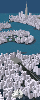 In order to get the hang of the new "hi-resolution" style that 720x400 permitted, I also decided to try some experiments with the other areas of the game's art. Much like Technobabylon, wanted a nice view of the city to set the scene on the main menu, and made use of another useful feature of Blender - hair. Specifically, the ability to choose a group of models to act as the hairs, growing from follicles across a mesh. With the aid of maps of Manhattan and Kenya to choose where the wig should go, I laid out a grid of roads and city blocks. Knocking together a few towers and hitting the "rogaine" button, I was surprised by how straightforward this was - if you want a go at the process yourself, here's the info. While a nice shape, it understandably lacked the detail it needed, with an appearance like something out of the start of Mirror's Edge than what I needed. Once again, Ivan's talents came in handy. I really ought to get around to paying him for it some day.